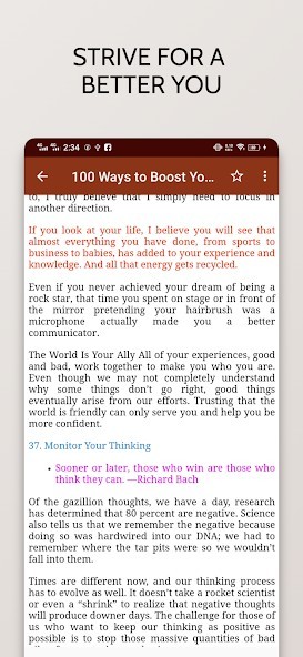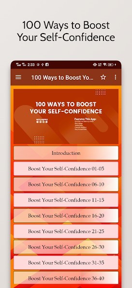 Your ideas, reflections, morals & values, and even random thoughts can build your self-confidence, but you have to be aware of them to get the full benefit. Research tells us that the human brain can think of five to nine things at the same time, so it can be a bit challenging to isolate and identify the confidence-building thoughts from those that do you no good.This Boost Your Self Confidence app is a real self-confidence booster in real life. In self-confidence challenge, you have to know the best way of self-confidence exercise through self-confidence meditation. This self-confidence app offline is not a self-confidence quotes app or self-confidence stories app but it is a real guideline of 100 ways to build up self-confidence.