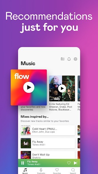 • Flow, for infinite, personalized mixes, featuring Flow genres and Flow moods for your fave sounds