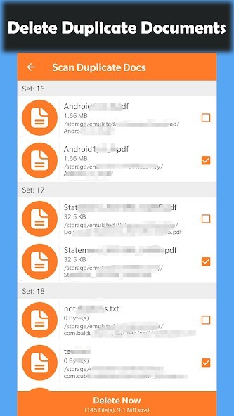 The Duplicate file remover app will help you recover loads of storage space on your android device.The Remove Duplicate Files app scans and displays duplicate photos, duplicate audios, duplicate videos or duplicate documents in sets. You can have the option to delete them by selecting duplicate files.