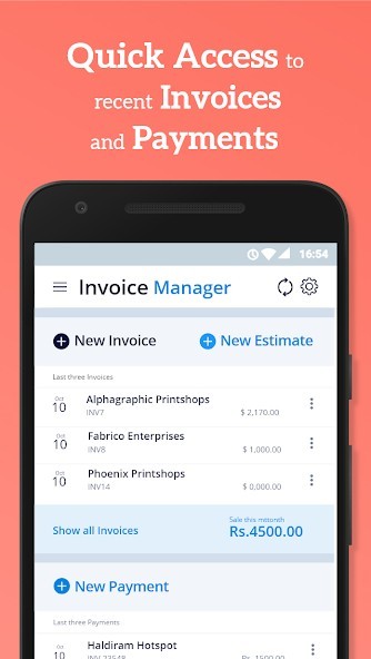 Invoice manager helps you right from raising an invoice to recording payment for the invoice and then finally providing a receipt all from one app.Using Simple Invoice Manager, you can also record purchases and keep track of inventory. Further you can record and track Sales Orders Received as pending or fulfilled. The App will also help you genrate profit and Loss reports