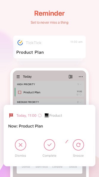 Delegate your memory to TickTick. It records all your tasks, providing immediate to-do list reminders to help you get things done. With multiple alerts for vital tasks and notes, you'll never overlook a deadline again