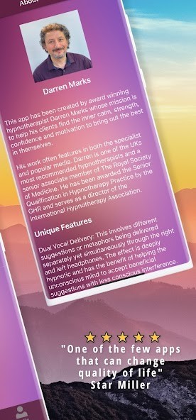 "Absolutely Sublime...I personally have a lot of experience doing this kind of suggestive work in the context of performance workshops and so my standards are pretty high. I've been exploring many hypnosis/affirmation apps, and I have to say that Darren's work is head and shoulders above the rest...Trust me you'll save thousands on psychotherapy. You can make tremendous progress with these tools."