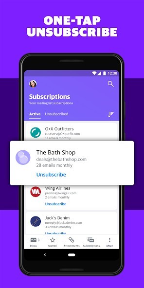 Go forth and unsubscribe from the spam and junk mail you don’t want to see in your inbox. Yahoo Mail shows all the mailing lists you're subscribed to on one screen and makes it easy to opt-out in one tap.